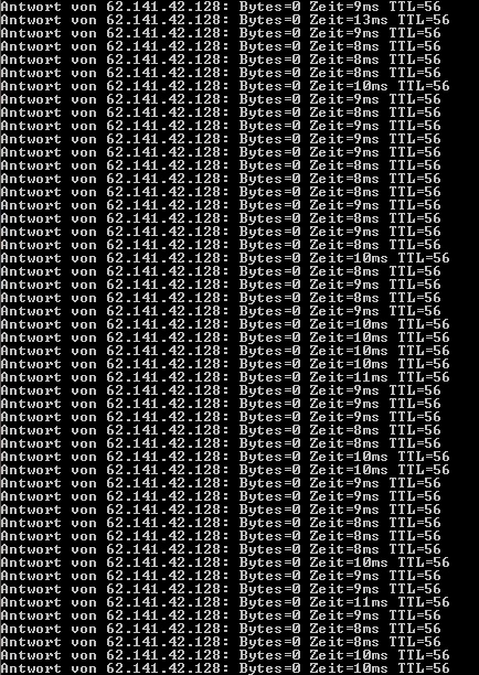 Ping zwischen 14-19 ms, ein Abstecher mi 48 ms dabei. Nach ner weile gabs in regelmäßigen Abständen kurze Timeouts.