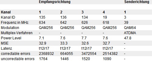 Kanal 1 Kanal ID 4 Frequenz in MHz 578 Modulation QAM256 Multiplex-Verfahren - Power Level 0.9 MSE 35.5 Latenz t12i17 correctable errors 4032 uncorrectable errors 2045