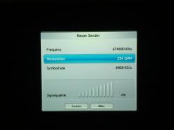 Bei der manuellen Suche bekomm ich einen Empfang von 0% angezeigt, wenn ich die manuelle FRequenz vom HD1 Sender eingebe (674 MHz 6,900 Msym/S 256 QAM) .