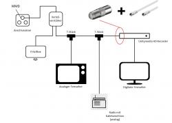 Ich möchte auch weiterhin mehrere Geräte in Reihe geschaltet haben. Das erste gerät ist ein analoger Fernseher (riesen Röhre), das zweite ein Radio mit Kabelanschluss (auch analog) und das letzte Gerät ist ein Flachbildschirm, an den der HD Recorder von Unitymedia angeschlossen werden soll. Geht das nun alles über das eine Kabel, was unter dem Putzverlegt ist? Zum besseren Verständnis habe ich eine laienhafte Konstruktionszeichnung beigefügt.