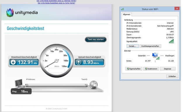 Bis zu 1,3 GBit/s sollen per WLAN-Übertragung möglich sein, jedoch sieht die Realität bei mir etwas anders aus... In der Regel steht unter dem Status der WLAN Verbindung am Windows 8 64bit Rechner "nur" 866,5 MBit/s, sporadisch kommt dann auch mal die 1 GBit/s Anzeige, jedoch erscheint die von mir favorisierte 1,3 GBit/s Anzeige nur sehr, sehr, sehr selten.