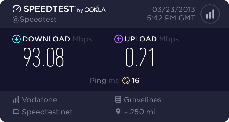 Mein Download liegt im Schnitt bei über 90,000Mbit, den Upload habe ich in den letzten Wochen immer bei höchstens 0,5Mbit gemessen, in der Regel ist er bei 0,3!