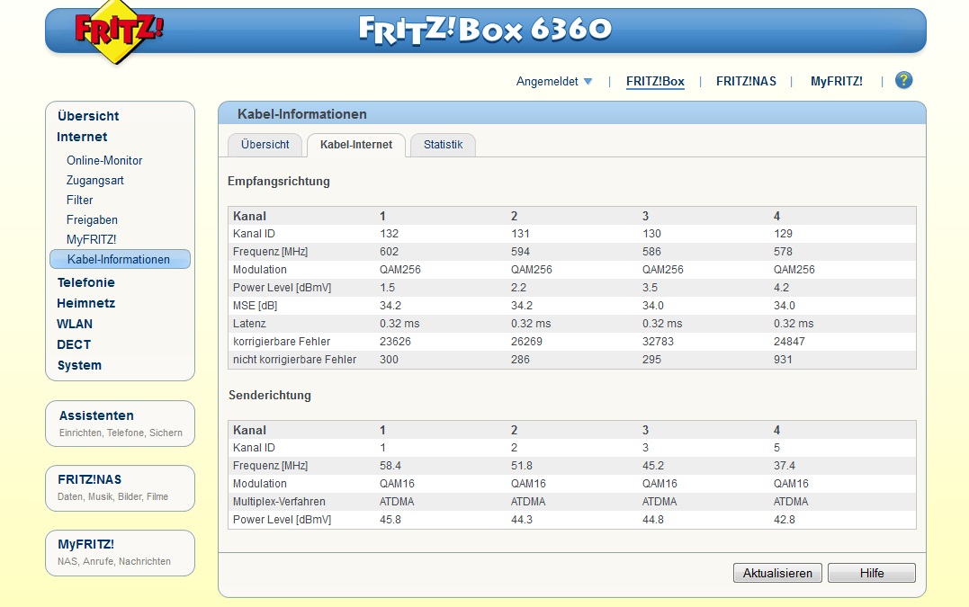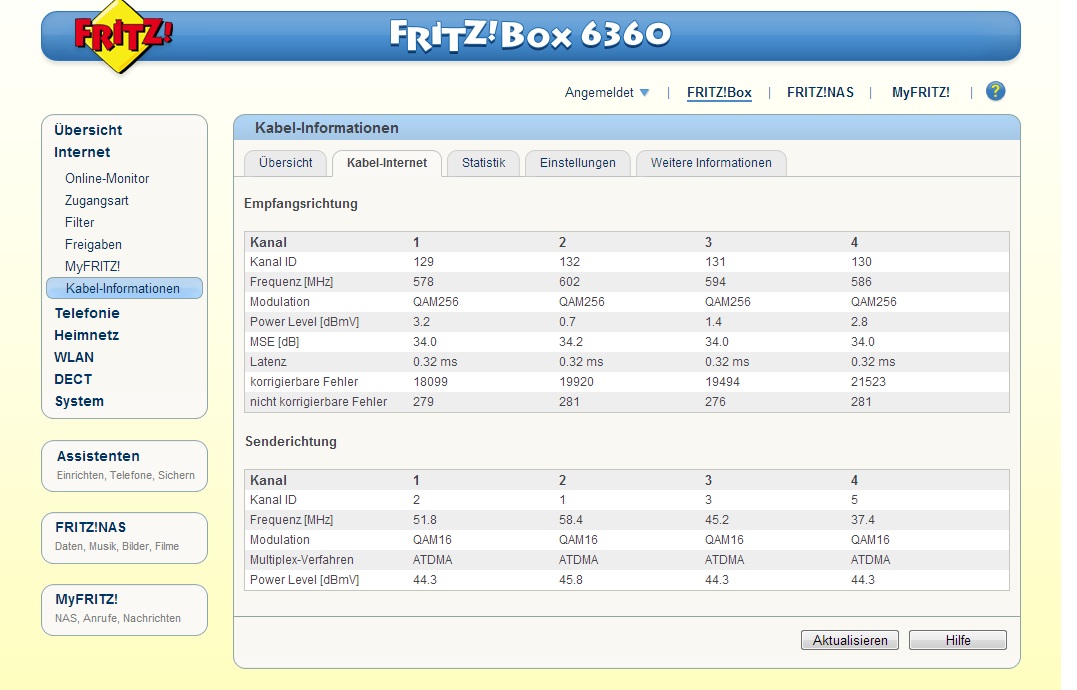 Channel 8: -4.1 dBmV 38.6 dB Wie man sieht, ist Kanal 4 und 8 stark abweichend von den anderen Kanälen. Nach dem Login sieht das ähnlich aus in der Detailansicht.