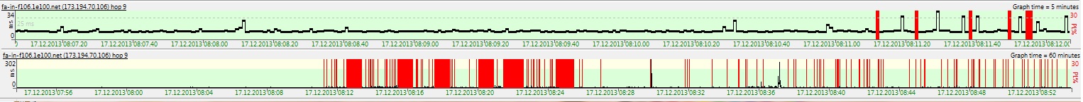Abs. Zeit Verl./Ges.= % Verl./Ges.= % Adresse 0 PC [192.168.123.10] 0/ 100 = 0% | 1 0ms 0/ 100 = 0% 0/ 100 = 0% router.lan [192.168.123.1] 6/ 100 = 6% | 2 5ms 96/ 100 = 96% 90/ 100 = 90% 10.129.64.1 0/ 100 = 0% | 3 8ms 13/ 100 = 13% 7/ 100 = 7% 7113A-MX960-01-ae10-1210.dar.unity-media.net [81.210.130.57] 0/ 100 = 0% | 4 11ms 16/ 100 = 16% 10/ 100 = 10% 13NOC-MX960-02-ae2.krp.unity-media.net [80.69.107.109] 0/ 100 = 0% | 5 13ms 6/ 100 = 6% 0/ 100 = 0% 1411G-MX960-02-ae9.nss.unity-media.net [80.69.107.6] 7/ 100 = 7% | 6 11ms 15/ 100 = 15% 2/ 100 = 2% 1411G-MX960-01-ae0.nss.unity-media.net [80.69.107.205] 0/ 100 = 0% | 7 11ms 18/ 100 = 18% 5/ 100 = 5% google.dus.ecix.net [194.146.118.88] 0/ 100 = 0% | 8 15ms 13/ 100 = 13% 0/ 100 = 0% 209.85.251.150 87/ 100 = 87% | 9 --- 100/ 100 =100% 0/ 100 = 0% 209.85.251.248 0/ 100 = 0% | 10 --- 100/ 100 =100% 0/ 100 = 0% 209.85.254.116