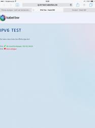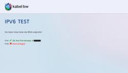 Nach langem Herumprobieren hatte ich dann heute Mittag auch einmal Erfolg, ich konnte in der FritzBox eine IPv6-Freigabe einrichten und konnte meinen Webserver pingen und sogar aus dem Internet erreichen (allerdings nur von manchen Computern). Plötzlich ging beides nicht mehr. Darauf hin habe ich lange herum gesucht und plötzlich folgendes festgestellt. Alle ipv6-Tests wie z.B. test-ipv6.com sagen mir plötzlich, ich habe keinerlei IPv6-Konnektivität. Seiten wie ipv6.google.com verlaufen plötzlich im Timeout. Auch die Kabel-BW-Testseite sagt IPv6 nicht verfügbar (siehe Screenshot)