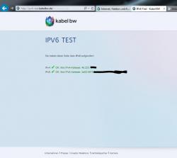 Nach langem Herumprobieren hatte ich dann heute Mittag auch einmal Erfolg, ich konnte in der FritzBox eine IPv6-Freigabe einrichten und konnte meinen Webserver pingen und sogar aus dem Internet erreichen (allerdings nur von manchen Computern). Plötzlich ging beides nicht mehr. Darauf hin habe ich lange herum gesucht und plötzlich folgendes festgestellt. Alle ipv6-Tests wie z.B. test-ipv6.com sagen mir plötzlich, ich habe keinerlei IPv6-Konnektivität. Seiten wie ipv6.google.com verlaufen plötzlich im Timeout. Auch die Kabel-BW-Testseite sagt IPv6 nicht verfügbar (siehe Screenshot)