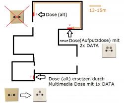 Genauer bin ich umgezogen und habe eine Wohnung mit den normalen Kabeldosen ohne DATA-Anschluss. Um das Ganze mal zu vereinfachen habe ich eine kleine Skizze angefertigt, die meine "Wunschkonfiguration" beinhaltet