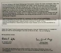 Kann denn der Preis während der Laufzeit einfach so geändert werden? Ich habe jedenfalls keine Post erhalten, obwohl ich, wenn ich das richtig gelesen habe, zur Zielgruppe gehören sollte (2 Play 50 + Telefon Komfort, seit Juni 2013). Die ersten 2 Vertragslaufzeit waren im Juni 2015 zu ende. Weil ich bewusst nichts gemacht habe, hat sich der Vertrag um ein Jahr bis Juni 2016 verlängert. Ich wäre jetzt davon ausgegangen, dass ich bis zur nächsten Vertragsverlängerung Post von UM erhalten könnte.Nein - es geht hier nicht um irgendwelches Vertragsende.Solange der bestehende Vertrag noch läuft, wirst du auch keinen Brief bekommen. Ich vermute aber, dass, wenn man den bestehenden Vertrag nicht rechtzeitig mit Wahrung der Kündigungsfrist (bei mir 2 Monate, 2 Play 50, Vertragsende Mitte Juni) kündigt, den Brief mit der Erhöhung eintrudeln wird...
