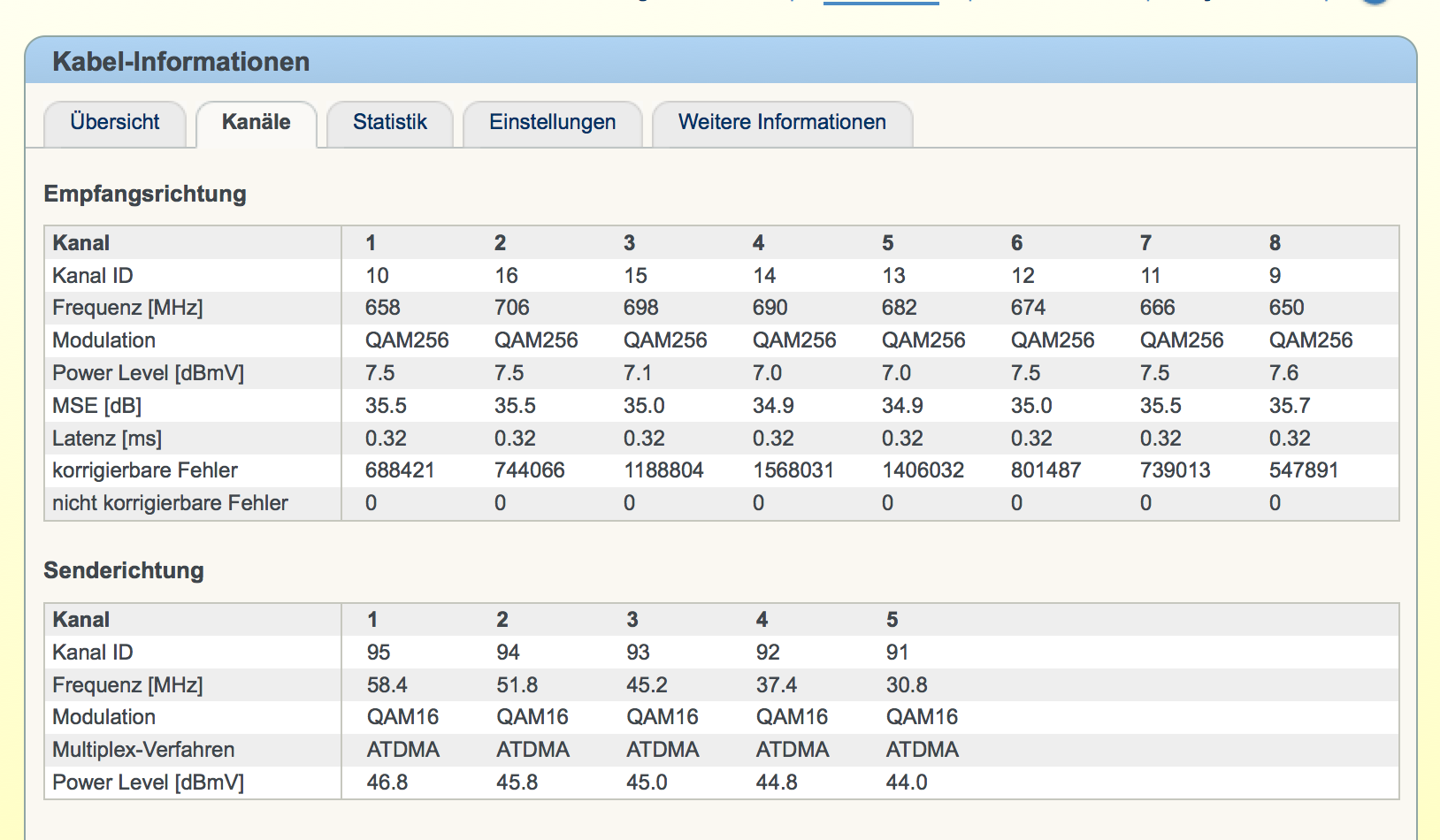 Der Powerlevel im Downstream ist etwas zu hoch, das kann Probleme machen, muss aber nicht. Für die Hotliner sind die Werte immer die Fehlerursache, sobald diese nicht 100%ig im Soll sind.