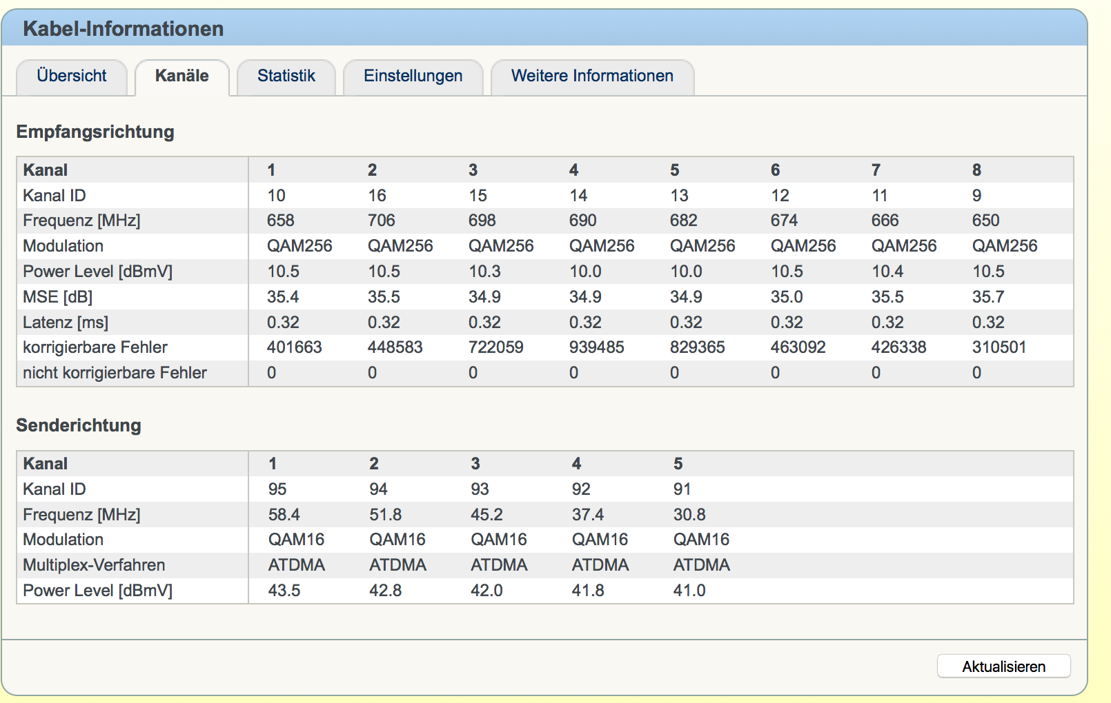 Ist bei mir persönlich auch ein bisschen geringer.Aber laut Grenzwerte ist Regel/Vorgabenkonform von -3,9 bis + 13dBmV.