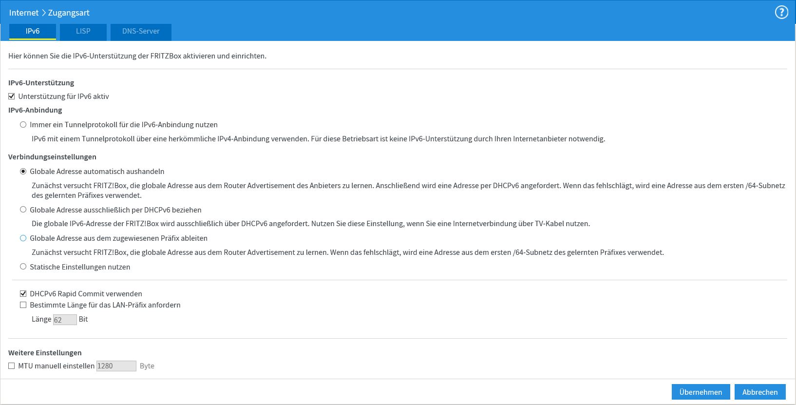 Ja, den kann man anklicken, aber was soll das bringen :kratz:Oben der RadioButton "Immer eine native IPv4-Anbindung nutzen" sieht komisch aus. Kann man den drücken?