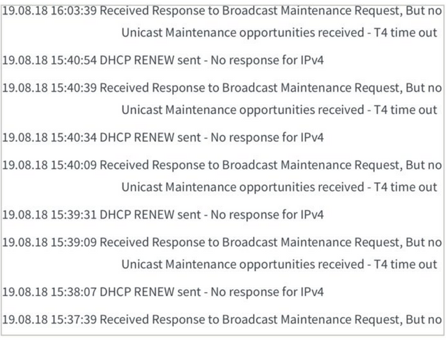 Was zeigt das Modem denn für eine interne IPv4 an? Ich bekomme ab und an "DHCP RENEW WARNING - Field invalid in response v4 option" aber habe keine Probleme.