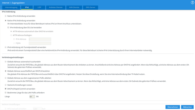 Für Dualstack wäre es "Natives IPv6 verwenden" ohne den Haken bei "IPv4 über DS-Lite".