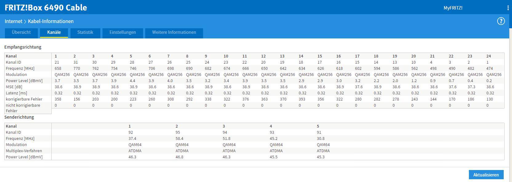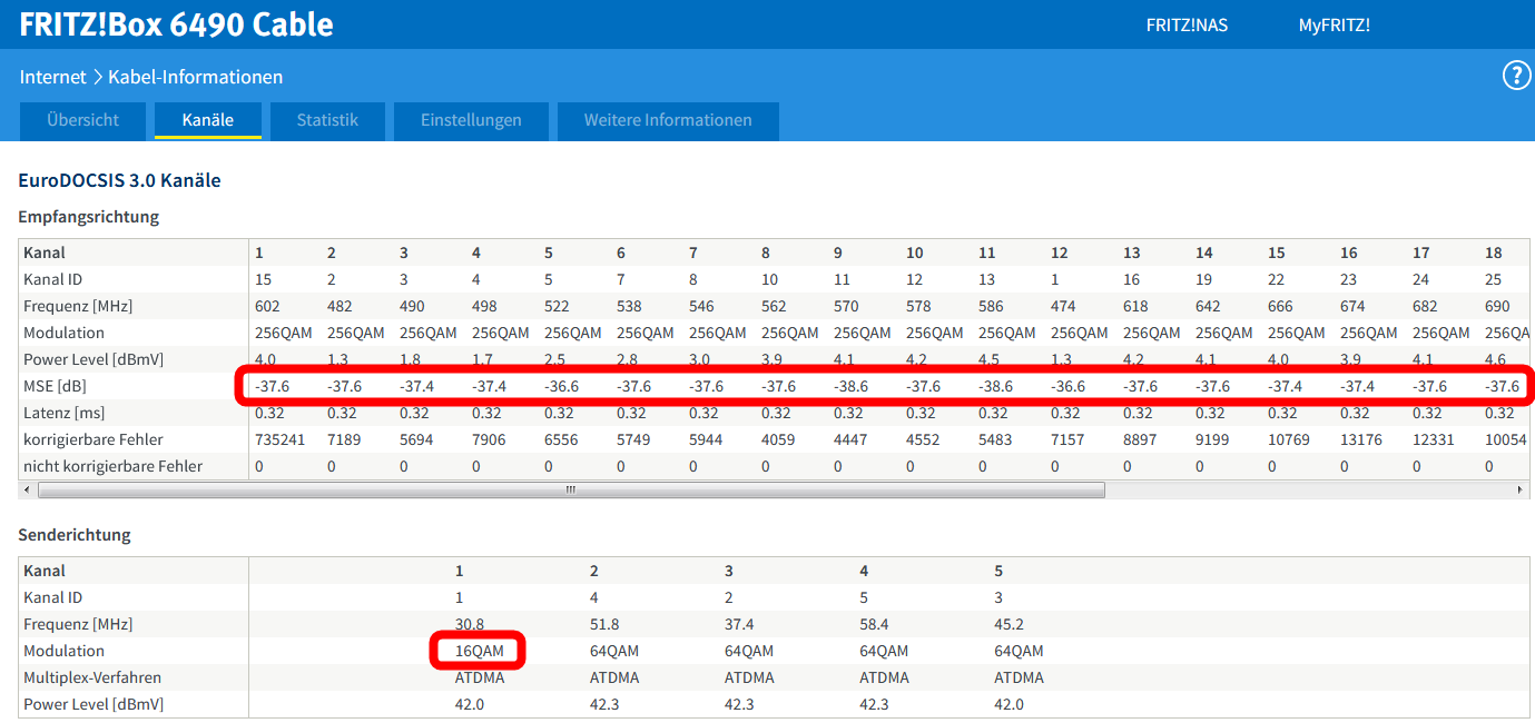 Hallo, wo ich deine Kanalwerte gerade so sehen, kommen bei mir drei Fragen hoch.Dabei war der Techniker erst vor drei Monaten vor Ort und hat sehr ordentliche 24/5 Kanäle hinbekommen.