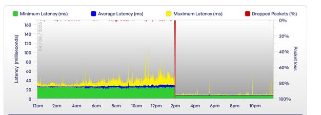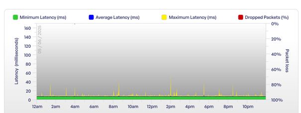 Ich habe Dual Stack und messe sowohl IPv4, als auch IPv6... beides sieht eher aus, wie bei Dir am 4.6. vor 04:00 - Bei IPv4 gibt es auch diese rote Gekrissel oben am Bildschirmrand, bei IPv6 fehlt das. Wie sieht denn das Ergebnis hier aus: