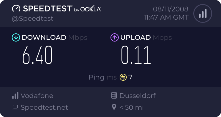 Und wieder ein Krefelder, auch hier in 47799 stimmt der Upload (30 - 100kbit/s) ganz und garnicht, der Download dagegen liegt mit 19.000kbit/s - 20.000kbit/s in der Norm. Mal sehen, vielleicht ändert sich ja bis morgen etwas daran... denn den Speed weiß ja wohl noch mein altes 56k Modem zu toppen :zerstör: :flöt: