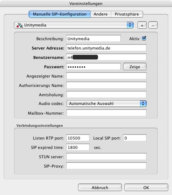 Dass ich Benutzernamen und Passwort eintragen muss, habe ich schon geschnallt. Auch die Adresse von Unitymedia. Meine Fragen: Ist das richtig bisher, und was muss sonst noch eintragen?